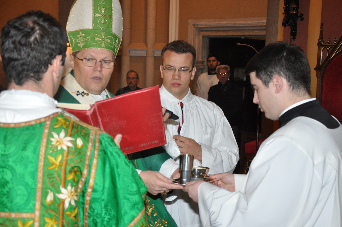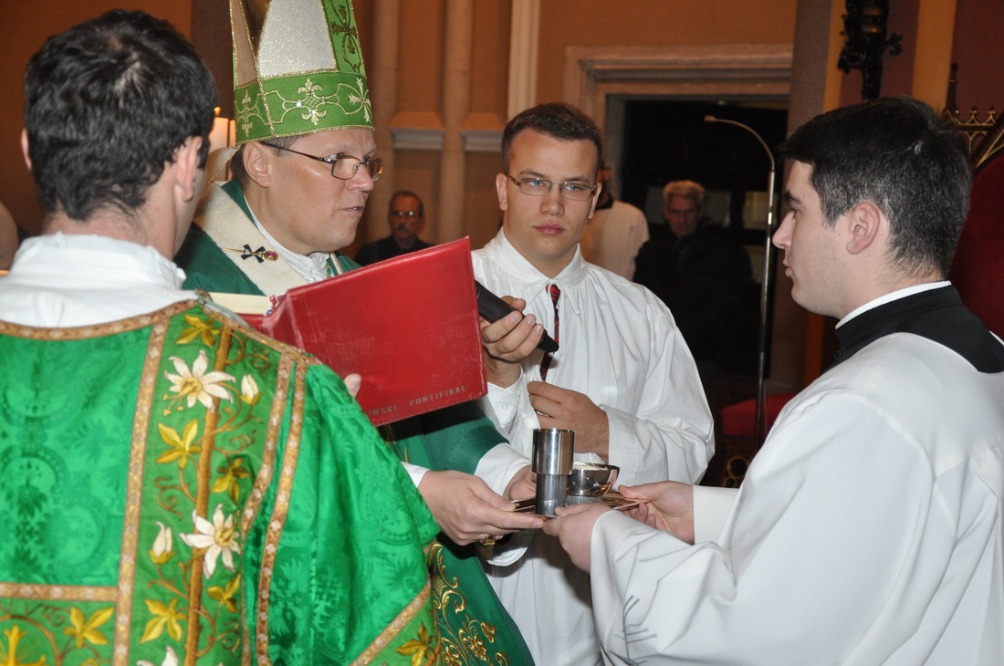 Аколитите од надбискупот Храњиќ како симбол за својата служба примија садови со леб и вино. Имено, од денот на примањето на оваа служба богословите ќе ја имаат можноста да им помагаат на свештениците и ѓаконите при делењето на Светата Причест. Терминот аколит ( грч. да се оди по некого; да се следи некој) значи литургиски придружник.